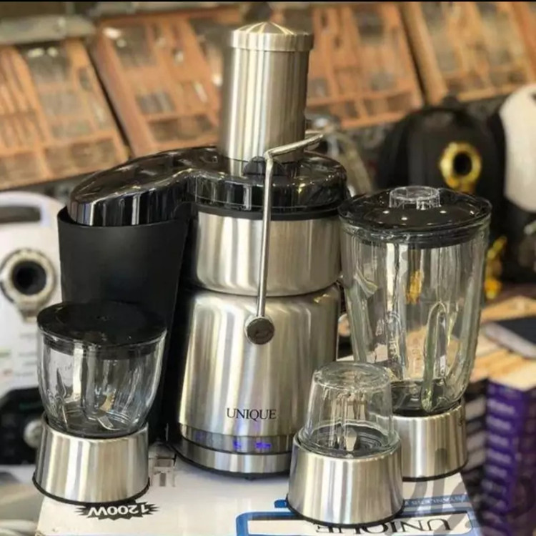 ⭕️ آبمیوه گیری لمسی چهارکاره Unique ✅ توان مصرفی 1200 وات ✅صفحه لمسی و نمایشگر دیجیتالی LED ✅ تنظیمات سرعت دارای ۵ عملکرد سرعتی ✅ دارای مخلوط کن، خردکن، آسیاب و پارچ آبمیوه ✅ دارای قابلیت پالس (عملکرد معکوس) ✅ جنس تیغه و صافی (استیل ضد زنگ) ✅ تیغه ها : ۴ پره از نوع شاخکی دو به دو ✅ دارای محافظ ضد داغ شدن خودکار بر روی موتور ✅ بدنه استیل ✅ سایز دهانه ورودی: 85 میلیمتر ✅ دارای دهانه ضد چکه ✅ جنس فیلتر: استیل ضد زنگ ✅ دارای قفل ایمنی (میکروسوییچ)